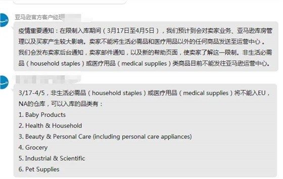 消息显示并经亚马逊官方招商经理证实,FBA在3月17号通知,暂时将家庭必需品、医疗用品和其他高需求的产品优先分配到配送中心,对于其他产品,暂时禁用了发货创建。